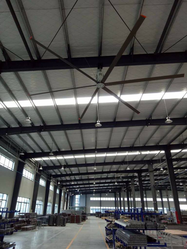 工業(yè)風(fēng)扇是一款廣泛應(yīng)用于工業(yè)廠房、物流倉儲、候車室、展覽館、體育館、商超等等高大空間,作為空間通風(fēng),人員降溫的一種常見工業(yè)用機器。比起傳統(tǒng)的暖通空調(diào)和小型的高速風(fēng)機,它有無可比擬的應(yīng)用優(yōu)勢,工業(yè)大風(fēng)扇耗電小,風(fēng)量大,單臺覆蓋面積可達(dá)1200平方米,堪稱高大空間通風(fēng)降溫的完美解決方案。